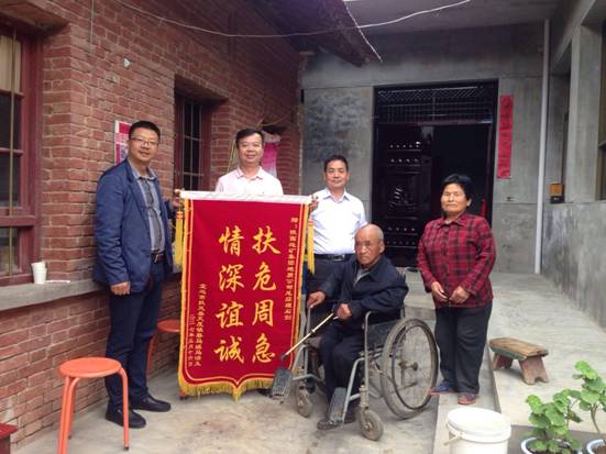 石總和王書記驅車到天度村委會未做停留,在駐村干部陪同下徑直來到結對幫扶的貧困戶馬治義家里。走進蔡馬組街道,老遠就看見近2米寬的紅色油漆大門特別顯眼,這就是馬治義享受危房改造政策剛剛落成的嶄新院子。進入大門,寬敞明亮的磚混結構平房映入眼簾,石總和王書記里里外外仔細查看房屋構造,高興的表示,房子既漂亮又實用,有了安全住房我們就放心了。馬治義坐在輪椅上激動的說:多虧地質公司的慷慨資助,我才能住上這么好的房子,我真的是做夢都沒有想到啊,太感謝,你們對我太好了,說著馬治義讓老伴取出了一面錦旗雙手遞給了石總和王書記,表達感激之情。隨后,石總、王書記和在院子里促膝交談,詢問生活上還有什么困難,馬治義夫婦表示,黨的政策享受了,領導們還為我費了這么多心,我知足了,沒啥困難了。