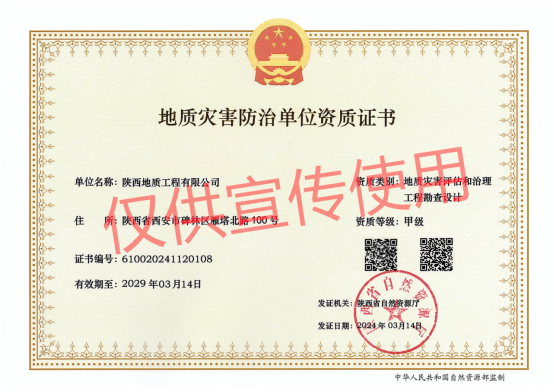 近日,自然資源廳發布2024年度陜西省第一批地質災害防治單位資質審批結果公告,公司地質災害治理工程施工、地質災害評估和治理工程勘查設計資質甲級延續成功獲批。